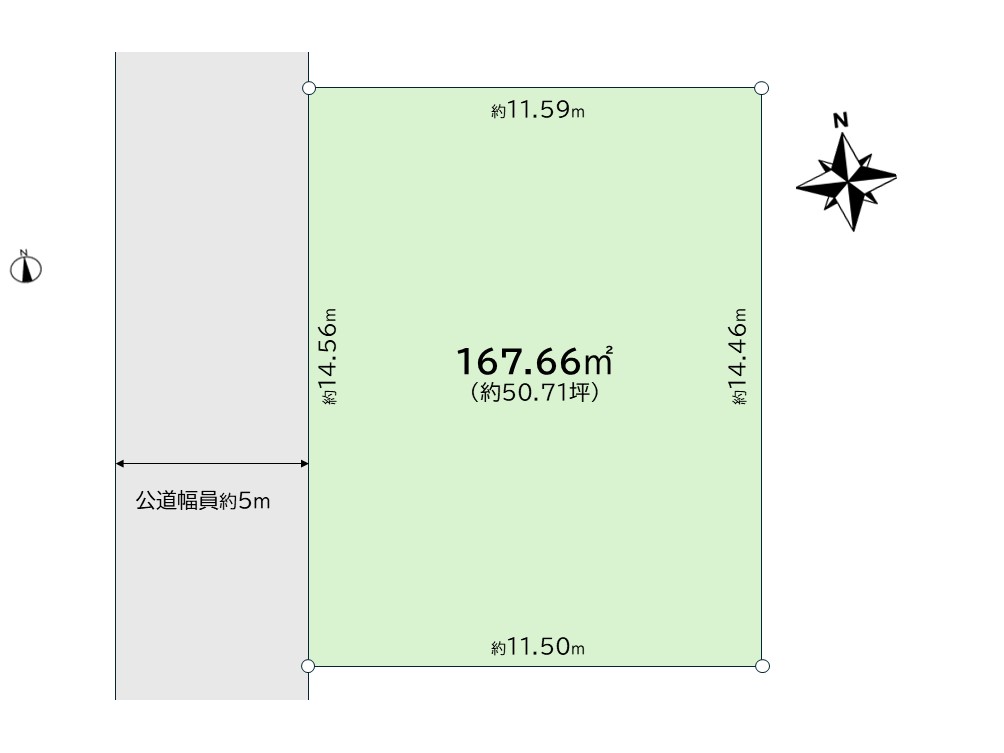 - 西側公道幅員約5.0mに約14.5m接道