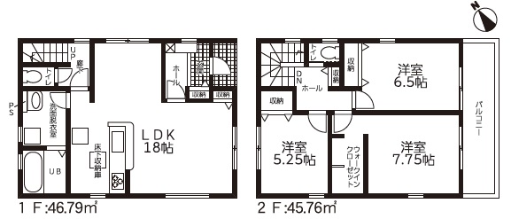 - 92.55㎡(27.99坪) 1階:46.79㎡ 2階:45.76㎡