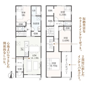 - 113.25㎡(約34.25坪) 1階 55.28㎡ 2階 57.97㎡