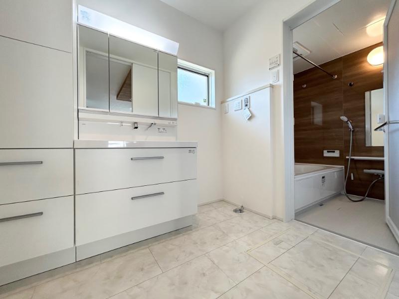 ●窓もあり風通しのよい洗面脱衣室 鏡の裏にたくさんの小物をしまえる全収納タイプの洗面台!