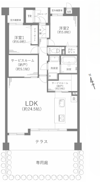 ●テラス+専用庭で合計43.65㎡のスペース有!