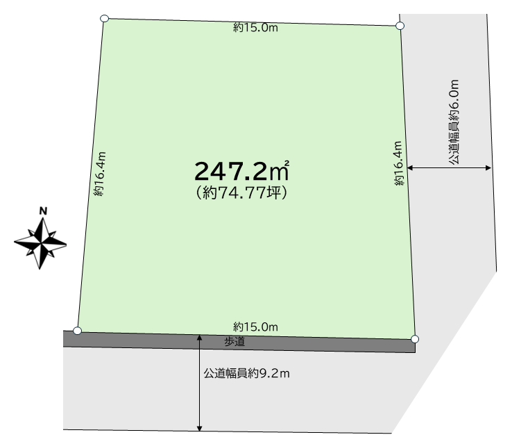 - 東側公道 幅員約6.0mに約16.4m接道 , 南側公道 幅員約9.2mに約15.0m接道 ※南側に歩道あり