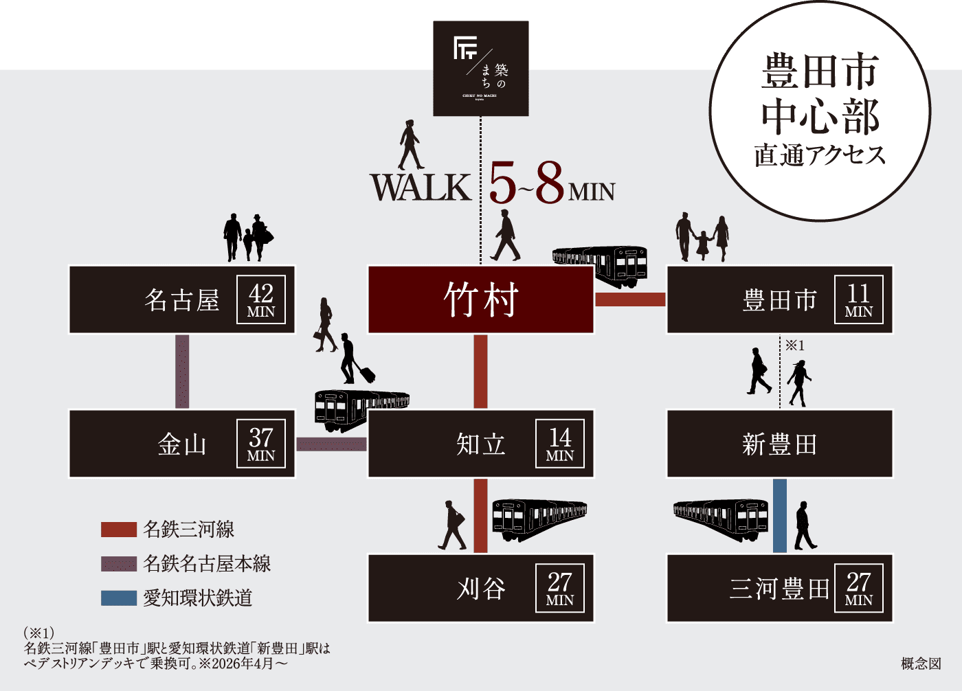 スマートなアクセス環境。 - 名鉄三河線「竹村」駅からは、豊田市中心部へダイレクトに。通勤や通学、休日のお出かけもスマートに移動できるフットワークの軽さが毎日をよりアクティブに広げます。