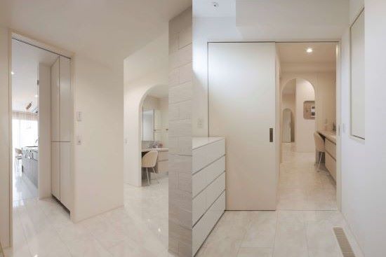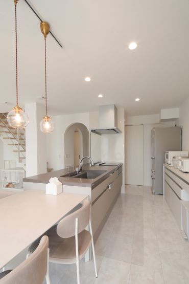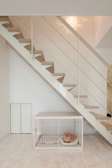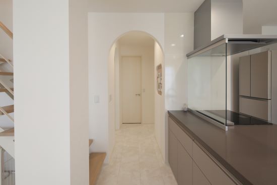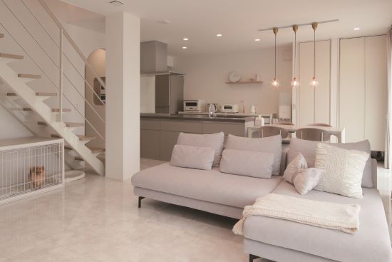 2階建|延床約33坪|敷地約51坪 最適に快適に暮らす家 生活のシーンを意識した間取り設計で 実感する″暮らしやすさ„の定義 1.利便性と空間の“広がり„を感じる動線 2.人とのつながりを感じられるリビング 3.家の雰囲気にやわらかさを加えてくれる アーチ状の垂れ壁 家族構成/ご主人、奥さま、お子さま1人 建 物/シンセ・スマートステージ 敷地面積/169.71㎡(51.33坪) 建物面積/1階:60.37㎡ 2階:48.90㎡ 延床面積/109.27㎡(33.0坪) 回遊動線を意識し廊下は最小限の間取りに リビングが極力“四角„になるように設計。 1階の各部屋をできるだけ広くするために 廊下を最小限にして、移動のしやすさを最も重視。 無駄のない利便性の高い間取りにしました。 アーチ状の垂れ壁が空間にあたたかみをプラス 家全体の雰囲気をさり気なく変えてくれるのが、 垂れ壁のデザイン。 直線ではなくアーチ状の垂れ壁にすることで、 丸みが加わり、空間にあたたかみのある雰囲気を演出しました。 十分な広さと、ミニマムなデザインながら機能性の高いキッチンは、料理時間をより楽しくしてくれます。 階段の下にどうしても生まれてしまうデッドスペースは、愛犬用のスペースとして活用 造作洗面台に合わせて、テクスチャ感のあるアクセントクロスにすることでメリハリのある空間に キーワード モダン外観 家事ラク動線 面積 〜35坪まで