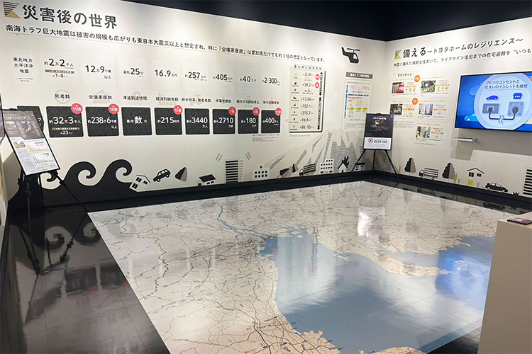 「プロジェクションマッピングで学ぶ防災コーナー」では、床にあるマップの上に、南海トラフ地震で想定されるさまざまなデータを切り替えて表示が可能。震度分布予想や地震波の伝わり方、津波の影響などを、“住んでいる場所”を起点に分かりやすく目視できるので、南海トラフ地震をより深く理解できます。また、「TQ FACTORY」にはその他にも、トヨタホームが採用している構造材の強度実験や工法、断熱性能、耐久性能に関する展示物など見どころ満載。トヨタホームの住まいづくりの“真髄”について具体的に触れることができます。