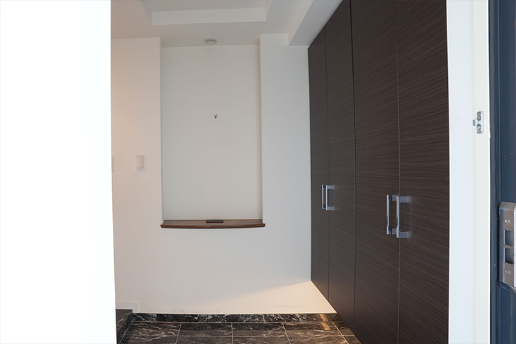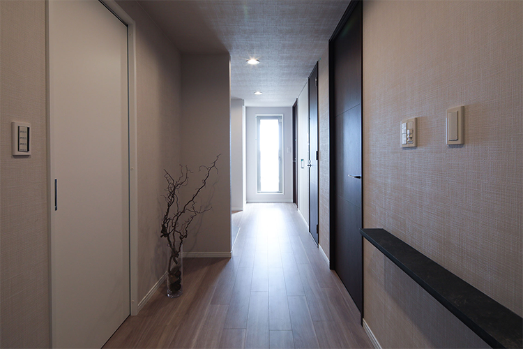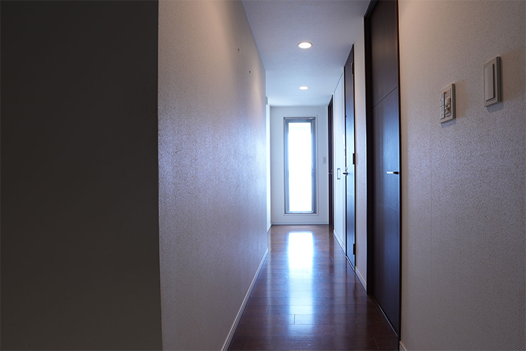 玄関横の洋室をサービスルームに変更する際、壁の位置を変更し廊下の幅を広げました。荷物を持った通行の際にも便利。突き当りの採光窓があるおかげで、廊下にも自然な明るさが確保されます。