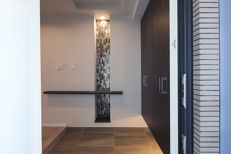 シンプルだった玄関には、見た目のアクセントになるタイルで華やかさをプラス。一方、土間のタイルはシンプルなものに変更することで、メリハリをつけた落ち着きのあるデザインに。