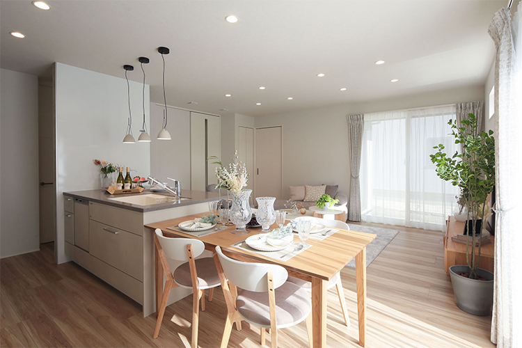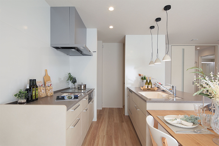 2階へと上がる階段を玄関直結にせず、LDKを通過した先に設置しているのは、家族が顔を合わせる機会を増やすためのアイデア。外出時も帰宅時も必ずキッチン横を通るので、自然とコミュニケーションが生まれるはずです。キッチンは、シンクとコンロを別々のカウンターに分けて、平行に配置する“セパレート”タイプのアイランドキッチンを採用。家族で料理を楽しむ際にも動線がスムーズです。