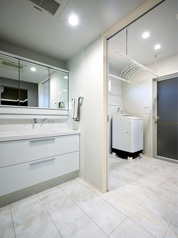 ランドリールームの横には、広い洗面室を配置。横幅1200mmの洗面台を導入し、2人同時に身支度するに十分な広さが確保されています。