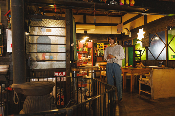 外観は、純日本家屋。中に入ると、まるで古い学校の校舎のようなどこか懐かしい雰囲気。天井には無数の星の照明が吊ってあり、インテリアの雰囲気も、飾られた雑貨の雰囲気もさまざまながら、不思議と居心地の良さを感じます。カラフルなタイル張りのカウンター席は、横並びで2席ずつのまるでカップルシートみたいで、デートにもぴったり。