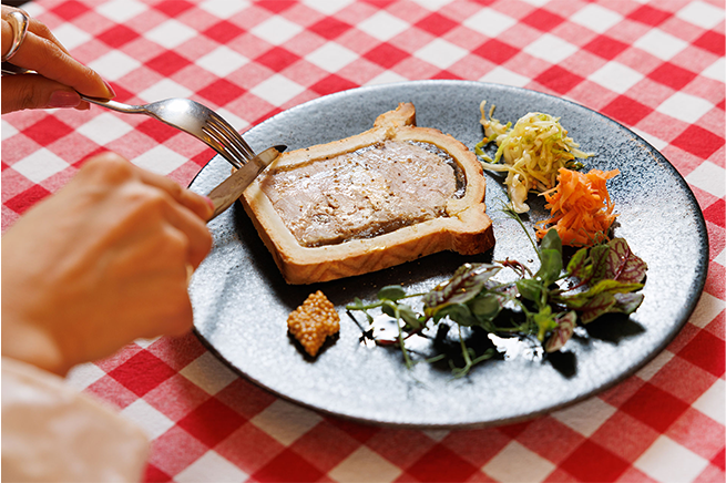 伝統的なフランス料理の一つ「カモとフォアグラのパテアンクルート」(2,000円)。