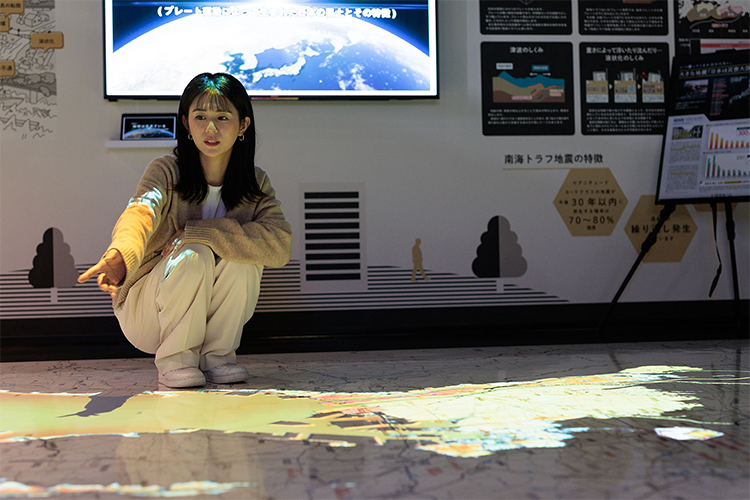 床に敷かれたマップを活用したプロジェクションマッピングで、南海トラフ地震の発生をよりリアルに感じることができます。