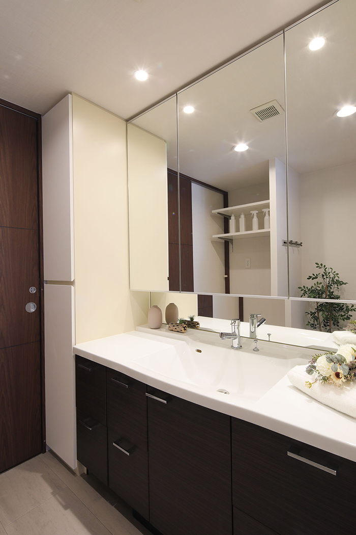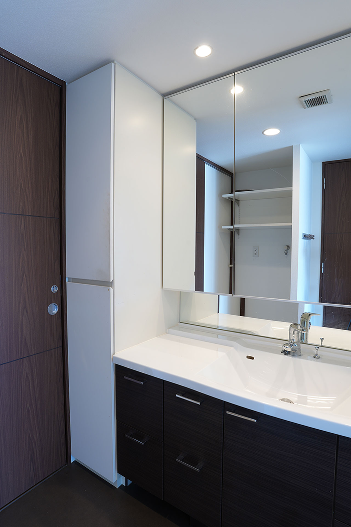 キッチンなどの設備はすべて最新のものに変更。洗面室へアクセスするための扉をなくして壁を設け、キッチン横に収納棚を追加。収納力が格段に向上しています。