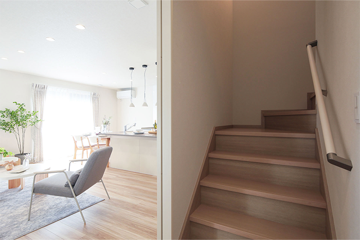 階段をLDKの奥に配置しているのは、家族の自然なコミュニケーションを創出する狙い。
