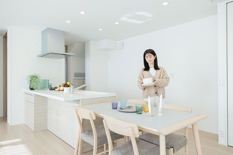 キッチンまわりは、パントリー・キッチン・ダイニングを横並びにレイアウトし、家事がはかどる無駄のない動線を実現。リビングからパントリーは死角になっているので、来客時にも中が見えることがなく安心です。