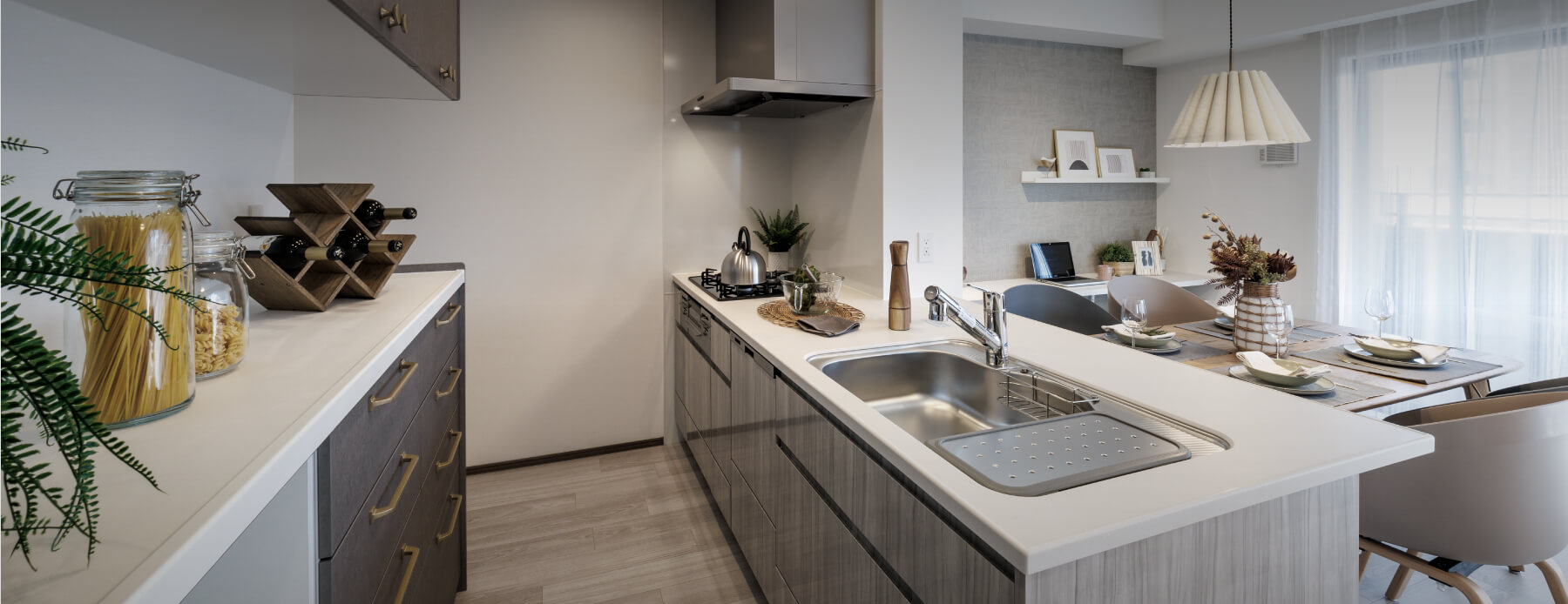 キッチンの天板には、上質感のある人造大理石を採用。汚れも拭き取りやすく、お手入れも簡単です。